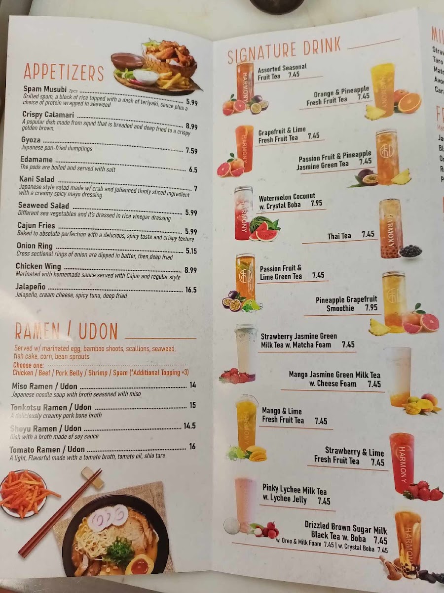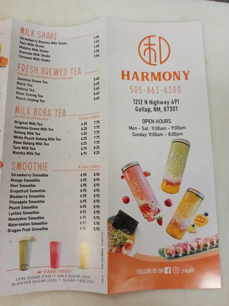 Step into a world of vibrant flavors with the Harmony Ramen/sushi/boba Tea Menu at 1212 US-491 in Gallup, NM. Whether you’re craving a steaming bowl of rich, savory ramen that hits all the right notes or craving the delicate balance of fresh sushi rolls, this menu has something to satisfy every mood. The ramen options are a comforting hug in a bowl, with broths that range from creamy and indulgent to light and umami-packed, while the sushi selections are artfully crafted, offering both classic favorites and inventive rolls that surprise with each bite.